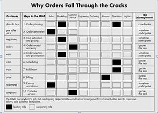 Mon, Oct 22, 2012 — Customer Relationship Management The idea that a company can increase their competitiveness by focusing on how a company interacts with its customers is not new but little has been accomplished to this end across corporate America. In 1992 the Harvard Business Review published a ground-breaking paper called Staple Yourself to an Order. I came across this paper several years after it was written, while I was in an operations and logistics role and it captured my imagination. In essence what the paper was saying is that companies did not have an end-to-end process around customer relationship management. There were no processes in place to manage the customer at every interaction point in a consistent manner. There is a great chart in this document on page 6 entitled "Why Orders Fall through the Cracks" (see below) that really captures the issue and illustrates a typical organizational structure and what happens to a customer going through the entire process of placing an order.